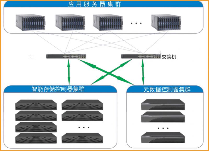 研信通 大規(guī)模集群存儲(chǔ)系統(tǒng)主要由應(yīng)用服務(wù)器集群、元數(shù)據(jù)服務(wù)器集群、智能存儲(chǔ)服務(wù)器集群三大部分組成。